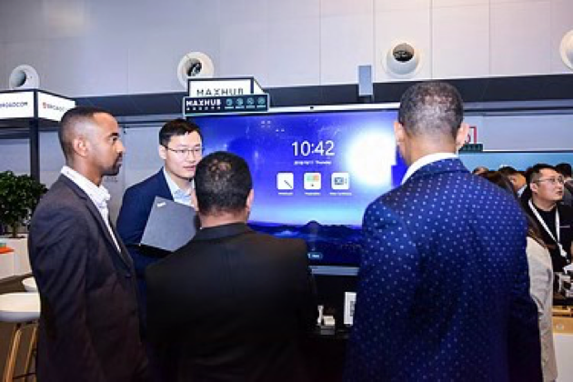 (展會現場,MAXHUB展位吸引海外嘉賓駐足了解)